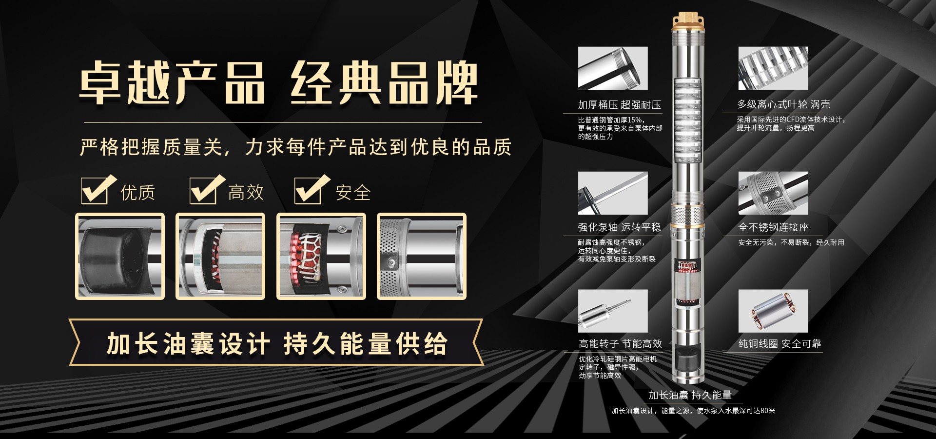 不僅僅是泵,更是流動的科技。十多年來,本公司堅持走:以質量求生存以科技創(chuàng)新求發(fā)展,重合同守信用的道路,生產經營得到迅速發(fā)展。更希望以后不管從發(fā)達城市到新農村,從工業(yè)制造到尖端科技產業(yè)都隨處可見創(chuàng)江井泵的身影,創(chuàng)江深井泵已成為干萬用戶心目中優(yōu)質和信心的保證我們將以優(yōu)質的產品和最完善的售后服務來真誠與各界朋友開展廣泛的合作,共同創(chuàng)造一個美好的未來!